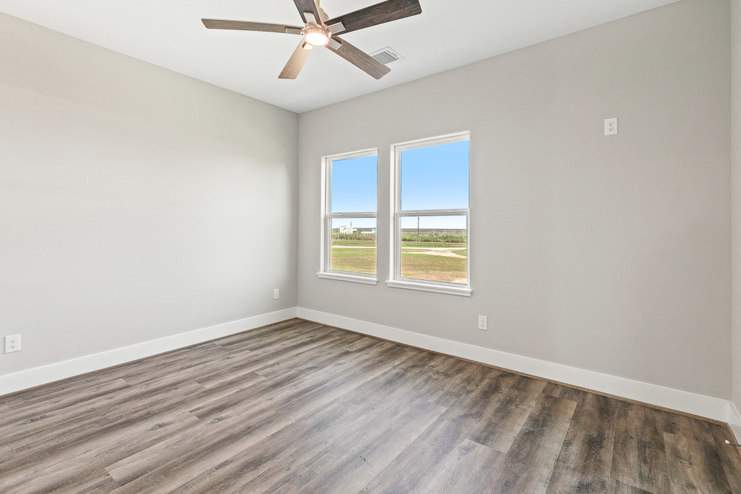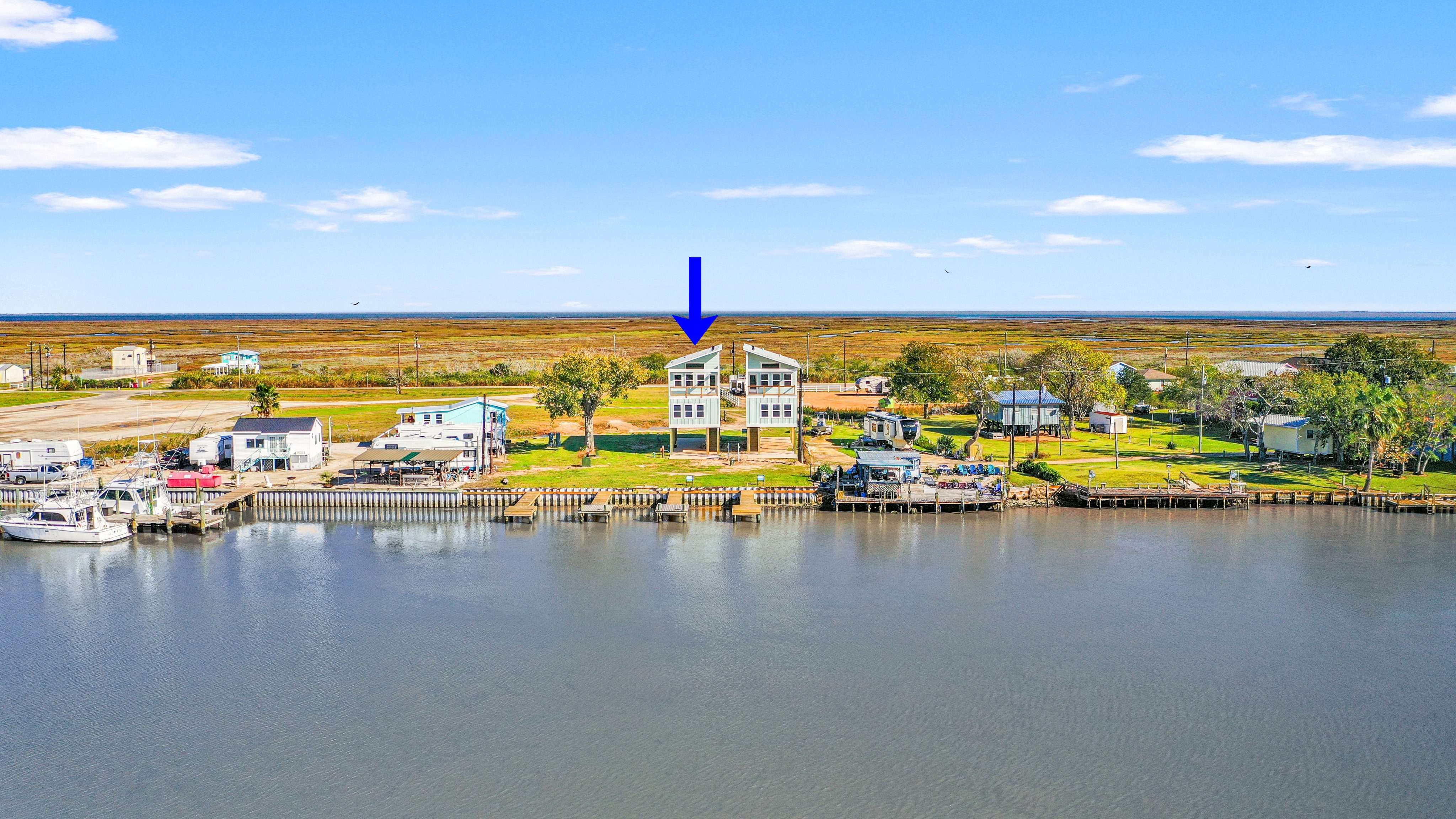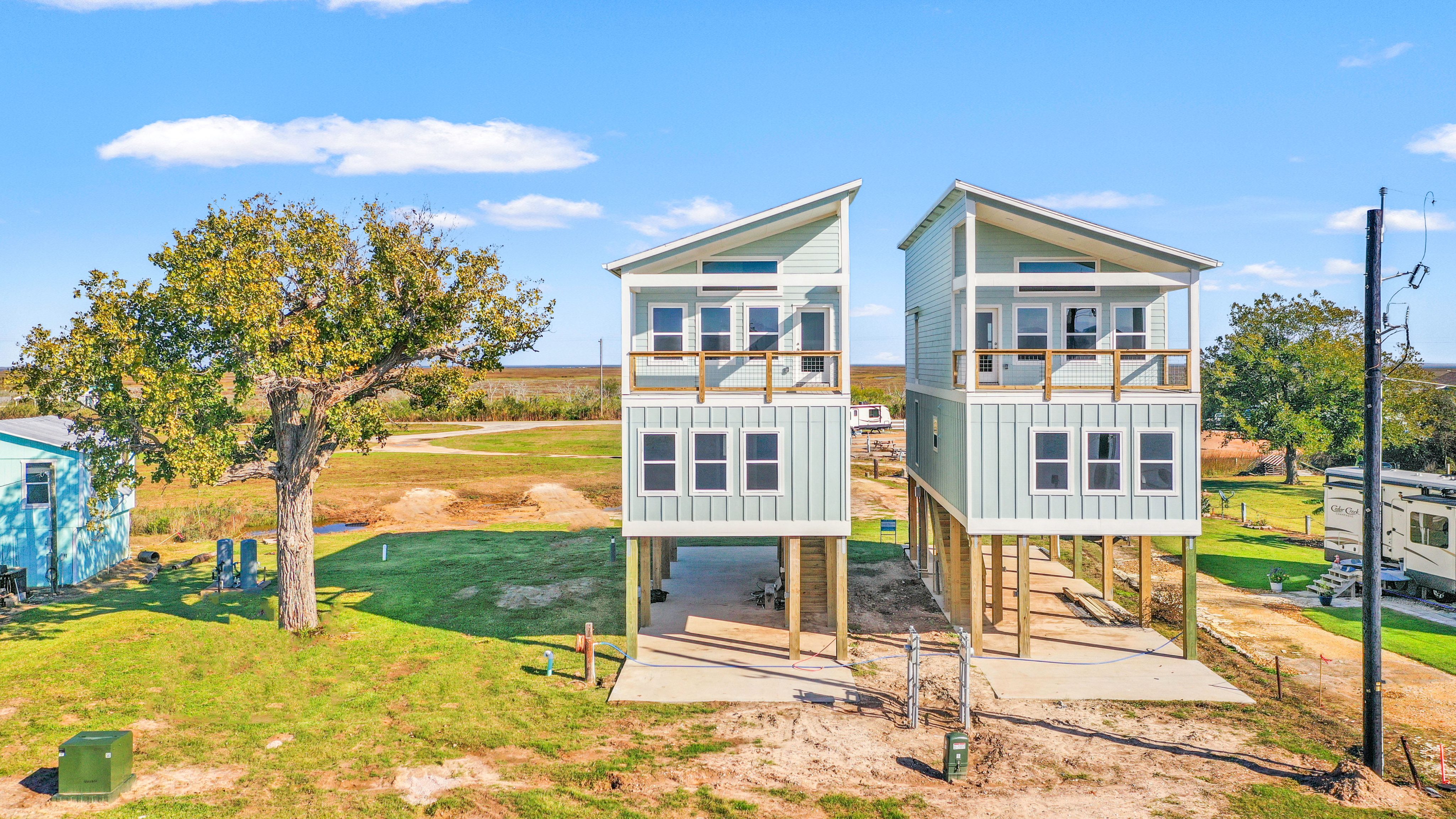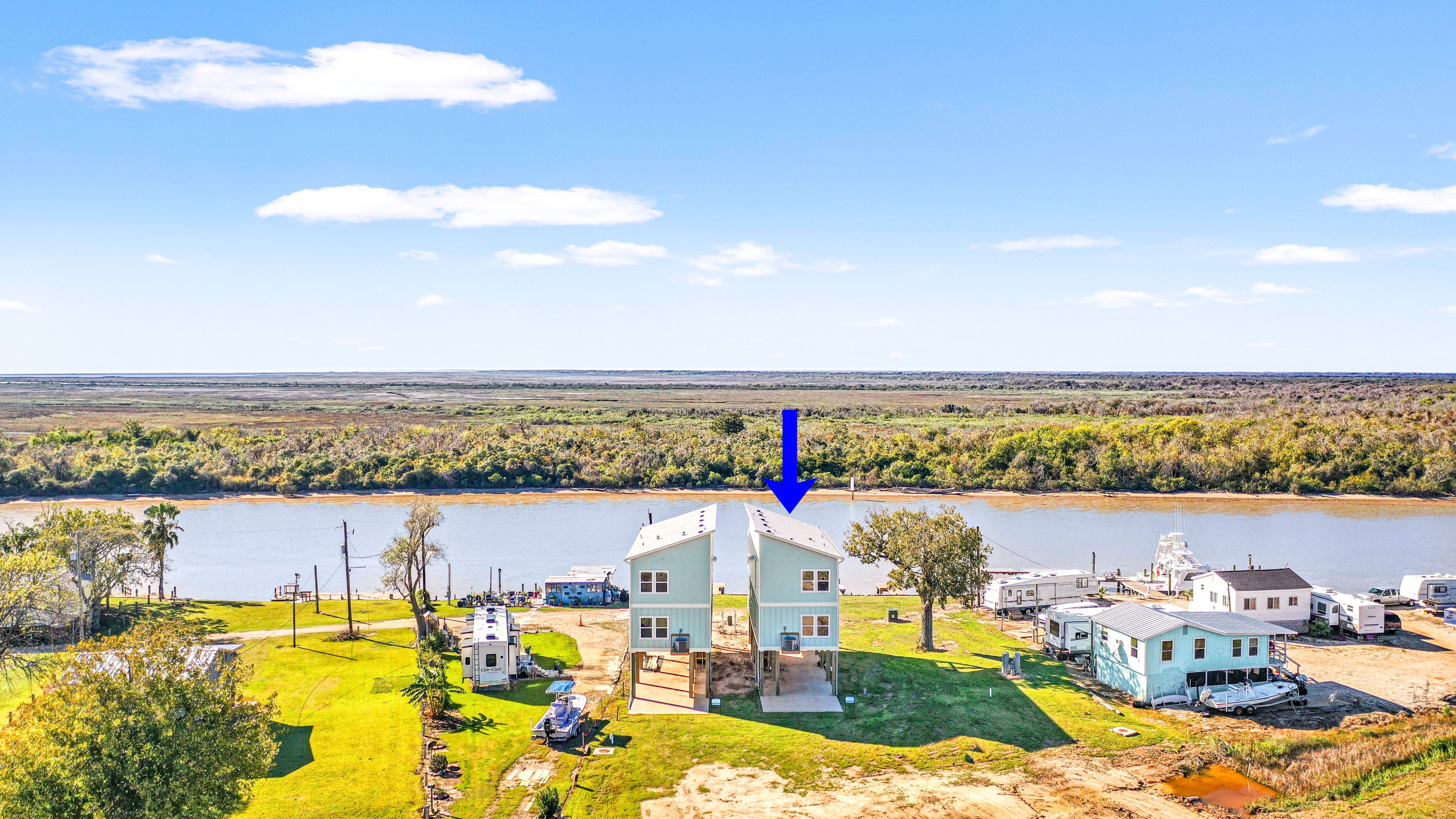 Riverfront new construction offering open water views of the Colorado River, along with long-range views over East and West Matagorda Bay. This 4-bedroom 3-bath home mirrors its neighboring plan and features quartz counters, stainless appliances, tile surrounds, LVP flooring, and cement board siding. The second level includes the main living spaces, a guest bedroom, and a full bath with private access that works well as a junior suite. Downstairs you’ll find the primary suite, two guest rooms, a guest bath, and stacked washer and dryer. A cargo lift will reach both floors, and the loft will have access, making it a great place for a couple of extra beds or storage. Enjoy sunsets from the upper deck or head to your private fishing pier for a slow morning on the river. Close to the beach and the area’s well-loved fishing grounds. Perfect for weekend use, full-time living, or a vacation rental. Reach out with any questions or to schedule a tour. Cargo lift & loft access to be installed.